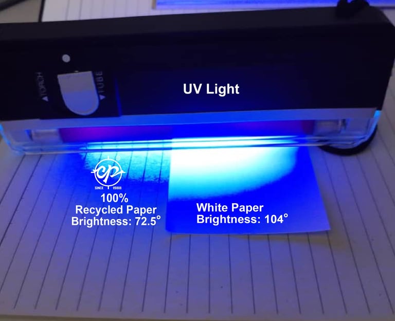 How normal paper causes eye stain, comparison under UV Light (Recycled vs Simili Paper)